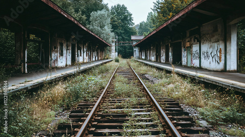 © Fonlinepix, Obraz premium An abandoned train station with crumbling platforms and rusted tracks, overgrown with weeds.