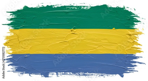 © Inforleo, Obraz premium An abstract artistic version of the Gabon flag, with green, yellow, and blue horizontal bands painted in textured brush strokes, expressive and modern.