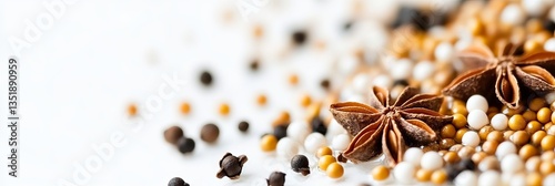 Fototapeta premium An abstract background featuring a variety of spices, including star anise and colorful peppercorns, arranged on a light surface with ample copy space