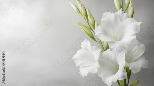 Fototapeta premium An abstract background featuring elegant white gladiolus flowers with green buds on a soft, blurred backdrop