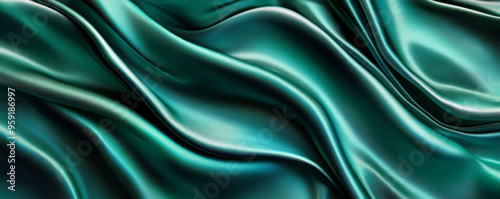 Fototapeta premium An abstract background showcasing 3D silk fabric with a gradient from deep emerald to light jade. The fabric waves add a sense of opulence and sophistication.