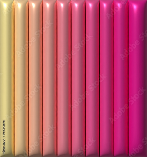 Obraz premium An abstract background with vertical glossy cushion panels that transition in a gradient from yellow to hot pink. 3D rendering illustration.