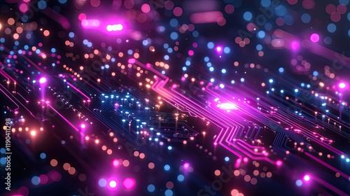 Fototapeta premium An abstract circuit board background uses neon blue and purple lines to represent digital technology