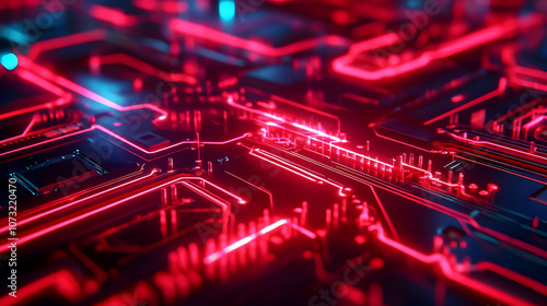 Obraz premium An abstract close-up of a red glowing circuit board with sharp illuminated...