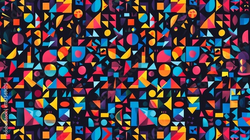 © Galib, Fototapeta premium An abstract, colorful geometric pattern with overlapping circles, squares, and triangles in various bright shades.