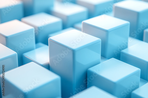 © Natalia, Obraz premium An abstract 3D grid of floating cubes with rounded edges, softly lit from the side, casting soft shadows on a pastel blue background,