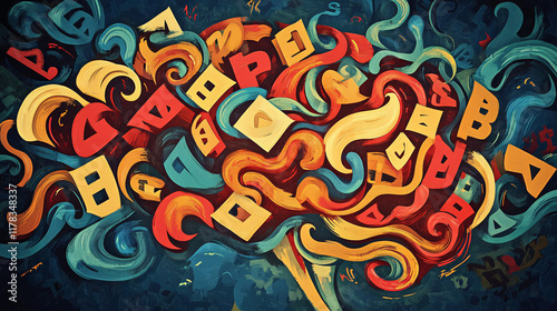 Fototapeta premium An abstract depiction of a brain absorbing language, with swirling letters...