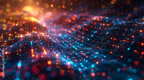 Fototapeta premium An abstract depiction of a neural network, with colorful data streams and nodes glowing against a dynamic background with a bokeh effect, representing the complexity of AI technology.