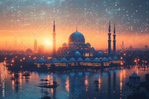Fototapeta premium An abstract digital background representing Ramadan, highlighted by...