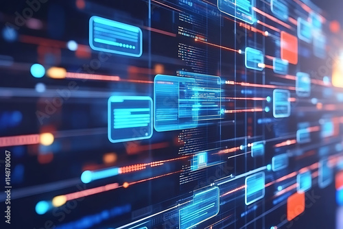 © Lora_ecology, Fototapeta premium An abstract digital banner featuring a data connection theme in blue and black colors