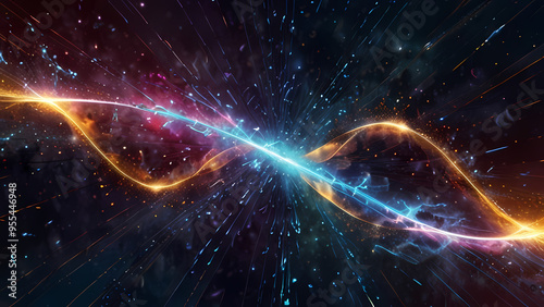 Naklejka premium An abstract digital illustration representing positive and negative ions in a cosmic field, with vibrant electric arcs and glowing particles, creating a sense of energy flow and balance