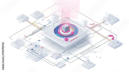 Fototapeta premium An abstract digital illustration showcasing a futuristic hub surrounded by interconnected elements in a tech-inspired design.