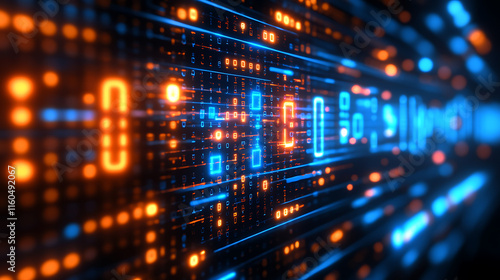 Obraz premium An abstract digital image showing luminous blue and orange binary code.