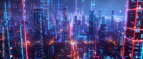 © Антон Сальников, Obraz premium An abstract dot point connected to a gradient line and a beautiful intricate wave line design. A big data technology connection concept connected to an abstract city.