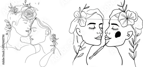 © Zaleman, Obraz premium An abstract face with flowers rendered in one line by modern drawing. Botanical print.