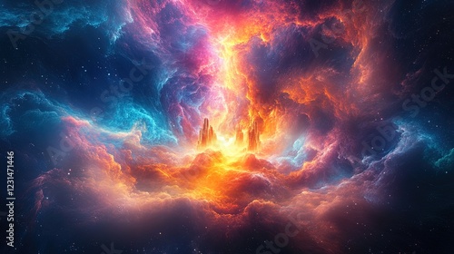 © Vien, Fototapeta premium An abstract floating fortress glowing with radiant energy in a magical sky