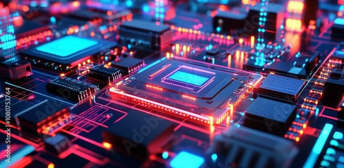 © AI04, Obraz premium An abstract futuristic technology concept image featuring a grid line and a circuit on a dark purple background.
