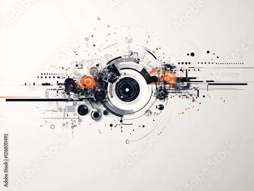 © youriy, Obraz premium An abstract geometric design with circular elements lines and splashes of orange on a white background