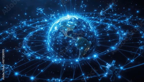 © P, Obraz premium An abstract, glowing blue network of interconnected lines and nodes forming a circular, planet-like structure against a dark background.