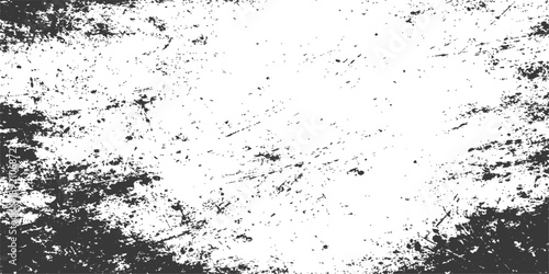 Fototapeta premium An abstract grunge background featuring a black ink splat and liquid water drop splashes creates a dirty paint texture pattern on a white paper design illustration
