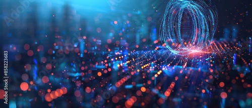 Fototapeta premium An abstract illustration blending light, energy, and motion in a fractal pattern, featuring blue hues against a black backdrop, symbolizing technological innovation and scientific concepts