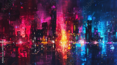 © SH Design, Obraz premium An abstract interpretation of a city skyline at night, with glowing lights and reflections.