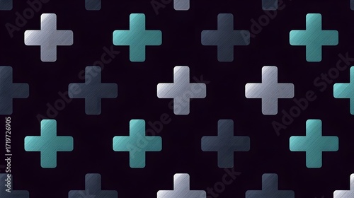 © pkproject, Obraz premium An abstract, minimalist background featuring a repeating pattern of stylized turquoise and gray crosses on a dark navy blue surface, creating a clean, consistent and sophisticated visual.