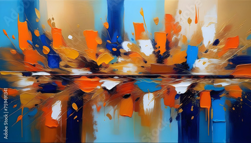 Fototapeta premium An abstract oil painting with blue, orange, and gold colors