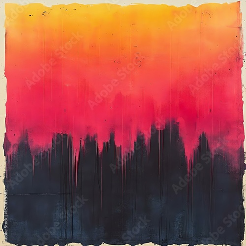 © CybStars, Obraz premium An abstract painting featuring vibrant gradient colors of orange, pink, and black, creating a striking visual contrast and depth.