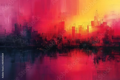 Obraz premium An abstract painting of a cityscape at sunset. The colors are vibrant and the...