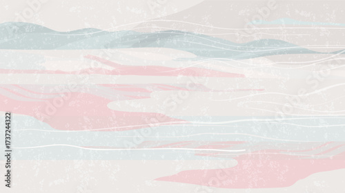 © Salomi art, Obraz premium An abstract pastel background with pink, gray, and blue textured shapes and lines reminiscent of painted waves and clouds. Decorative vector illustration.