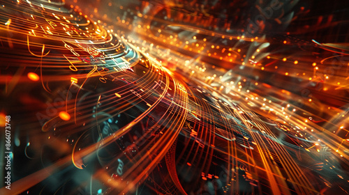 Obraz premium An abstract portrayal of musical notes and instruments in a dynamic, rhythmic...
