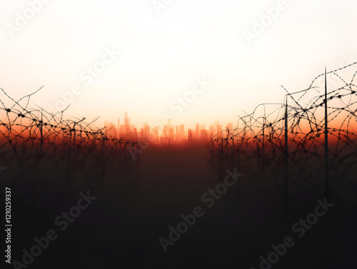 © Zape, Fototapeta premium An abstract representation of a military base with barbed wire fences, symbolizing defense. Military base wire design.