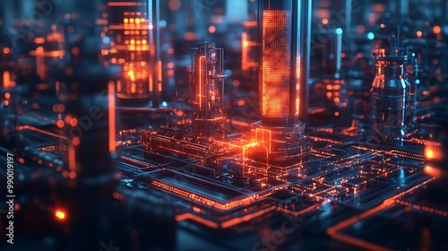 © Jack, Obraz premium An abstract tech background showcasing a smart factory environment with interconnected machinery and a glowing grid of data