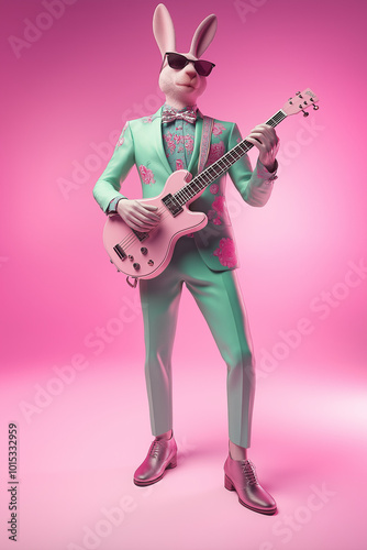 Obraz premium An abstract, trendy Easter bunny playing guitar and striking a human-like pose, dressed in a stylish hipster suit.