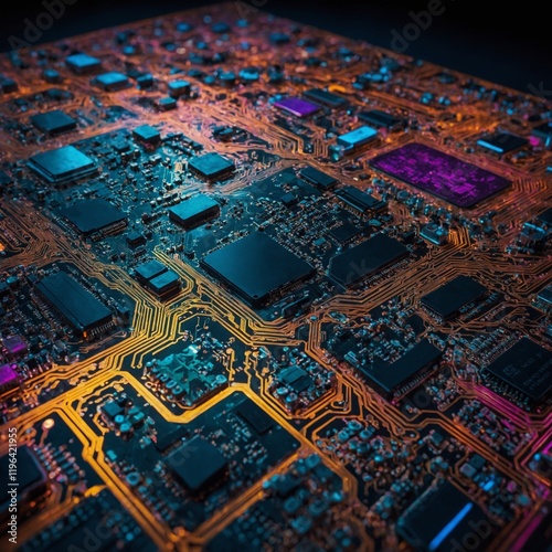© aqsa, Obraz premium An abstract, vibrant, and colorful technology background featuring a futuristic electronic circuit board design.