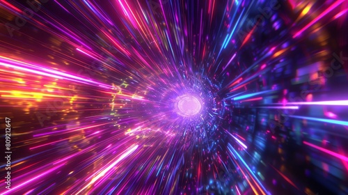 © Chingiz, Fototapeta premium An abstract, vibrant tunnel featuring a multicolor spectrum with neon light rays and colorful lines speeding through a dark background