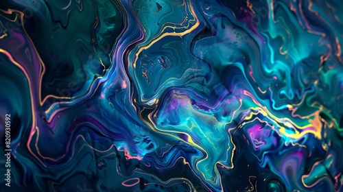 Fototapeta premium An abstract watercolor painting, random mix of dark blues, greens, and reds, with striking glowing gold lines forming a topographical map effect. Modern, disturbingly fluid abstract background.