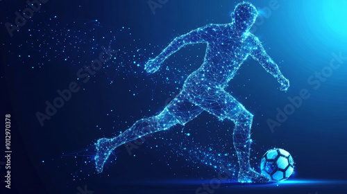 Fototapeta premium An abstract wireframe silhouette of a soccer player depicted in motion as he strikes the ball. The player is constructed from triangles and particles, emphasizing the dynamic form and athleticism of t