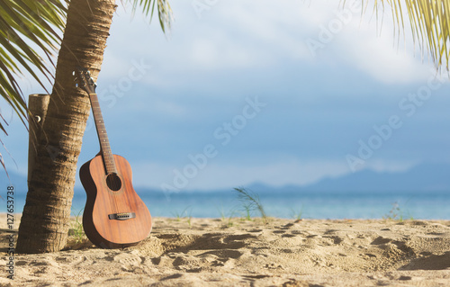 Fototapeta premium An acoustic guitar standing in the sandy beach under palm tree