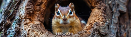 © Vodkaz, Fototapeta premium An adorable and affectionate chipmunk nestled in a hollow tree