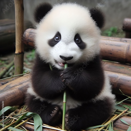 © Natasha, Fototapeta premium An adorable baby panda sitting and munching on bamboo perfect fo