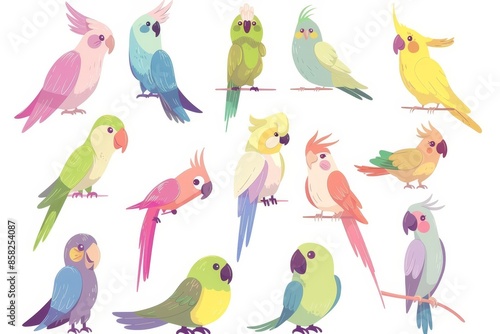 Naklejka premium An adorable collection of funny cartoon parrot characters in a jungle environment. Cartoon modern collection of various colorful exotic birds with beaks, wings and tales. Exotic animals and pets in