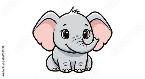 Naklejka premium An adorable gray baby elephant with large pink ears sits and smiles in this charming cartoon illustration.
