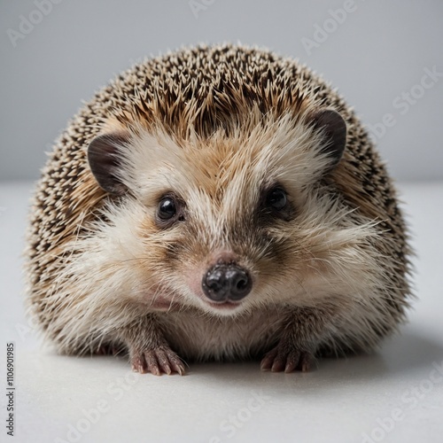 © Tariq, Fototapeta premium An adorable hedgehog curled into a ball on a clean white surface.