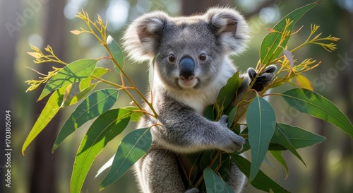 Fototapeta premium An adorable koala with soft grey fur sits peacefully amidst vibrant green eucalyptus leaves in a sunlit Australian forest.