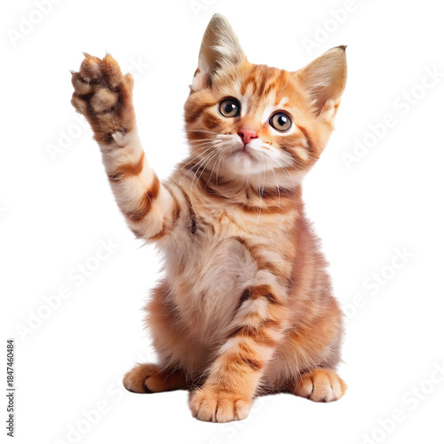 © Morium, Obraz premium An adorable orange tabby cat sitting and waving with its right paw