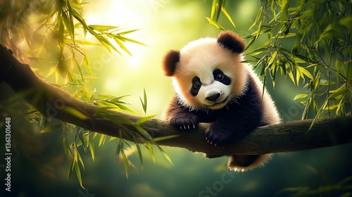 © Epep Gaming , Obraz premium An adorable panda cub sitting on a branch smiling softly