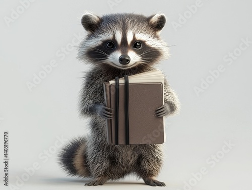 © Image Tree, Fototapeta premium An adorable raccoon standing upright holding a bound book against a plain, light background. The raccoon looks directly at the viewer.