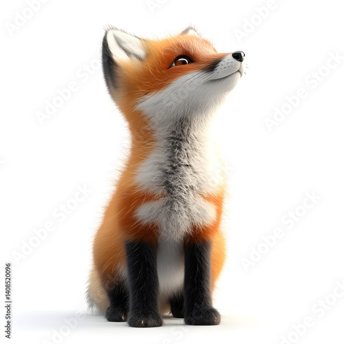 Obraz premium An adorable red fox kit sits looking up with fluffy fur and big curious eyes against a bright white background.